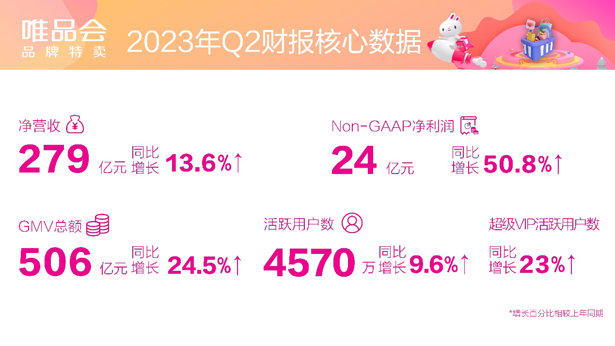 中国领先的在线品牌折扣零售商唯品会发布2023年第二季度财报。财报显示,唯品会第二季度实现净营收279亿元(人民币,下同),同比增长13.6%;Non-GAAP净利润24亿元,同比增长50.8%。同时,二季度GMV为506亿元,同比增长24.5%;活跃用户数达4570万,同比增长9.6%;订单数达2.138亿,同比增长14.7%。