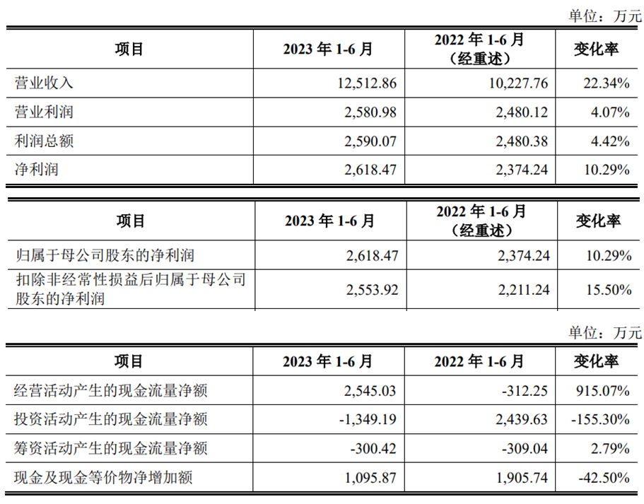 2023年1-6月,浩辰软件的营业收入为12,512.86万元,同比增加22.34%;净利润/归属于母公司股东的净利润为2,618.47万元,同比增加10.29%;扣除非经常性损益后归属于母公司股东的净利润为2,553.92万元,同比增加了15.50%;经营活动产生的现金流量净额为2,545.03万元,同比增加915.07%。