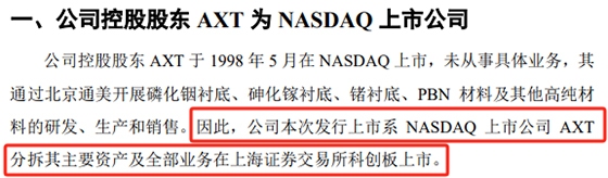 北京通美注册稿显示,AXT未从事具体业务,其通过北京通美开展磷化铟衬底、砷化镓衬底、锗衬底、PBN材料及其他高纯材料的研发、生产和销售。因此,北京通美本次发行上市系NASDAQ上市公司AXT分拆其主要资产及全部业务在上海证券交易所科创板上市。