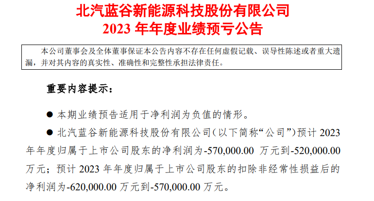 1月17日讯 北汽蓝谷1月15日晚发布2023年年度业绩预亏公告显示,预计2023年净利润为亏损52亿元到57亿元,上年同期亏损54.65亿元。