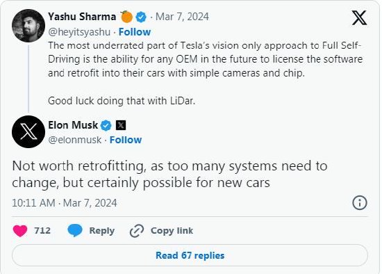 马斯克在X上写道,考虑到需要改变的系统数量,将FSD软件改装到现有汽车上可能不值得。不过,他补充说,将这款软件集成到新车上肯定是有可能的。