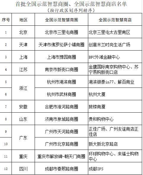 商务部网站公布的首批全国示范智慧商圈、全国示范智慧商店名单截图