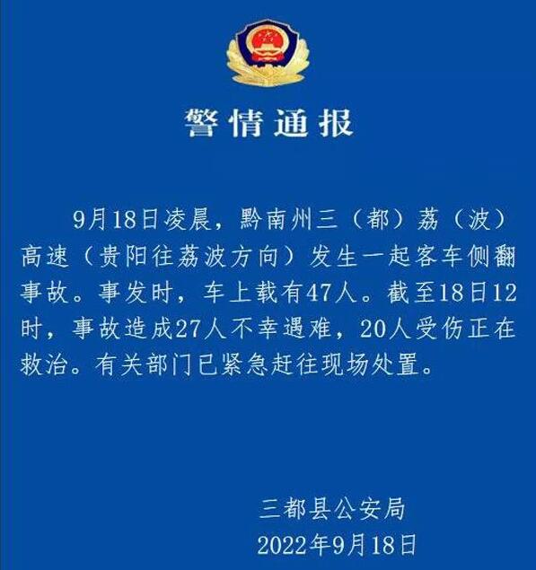 贵州省黔南布依族苗族自治州三都水族自治县公安部门通报,18日凌晨,黔南州三(都)荔(波)高速(贵阳往荔波方向)发生一起客车侧翻事故。事发时,车上载有47人。截至18日12时,事故造成27人死亡,20人受伤正在救治。有关部门已紧急赶往现场处置。(记者汪军)