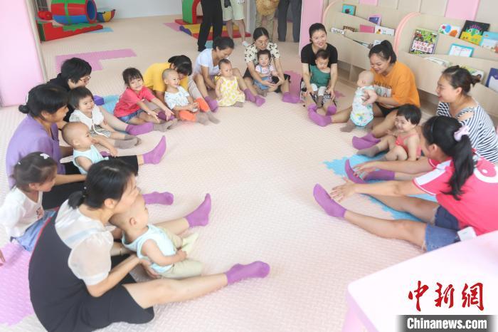 资料图:江西寻乌县一家婴幼儿照护服务指导中心内,工作人员指导家长和幼儿互动做游戏。刘力鑫 摄